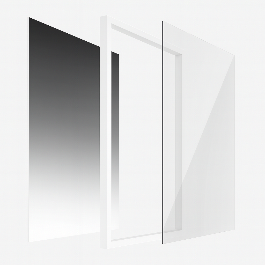 Proteção frontal com vidro acrílico 100% transparente de 2mm, que realça a elegância da peça, evita reflexos excessivos e protege a imagem sem perigo de quebrar como o vidro comum.